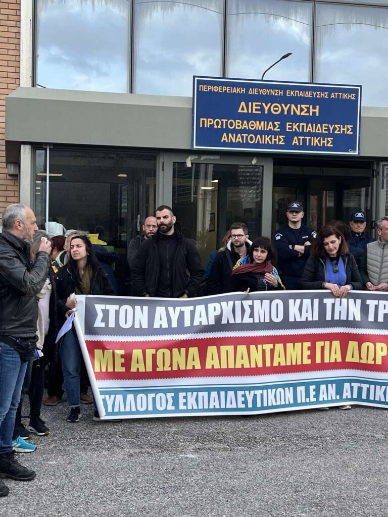 Καταγγέλουμε τη στάση του Διευθυντή Εκπαίδευσης ΠΕ Αν. Αττικής που αρνείται να συναντηθεί με εκπαιδευτικούς και γονείς με πρόσχημα ότι συζητά μόνο κατά μόνας και μόνο κατόπιν προγραμματισμένου ραντεβού, καλεί την αστυνομία κάθε φορά που υπάρχει κινητοποίηση ενώ στις 10/12 έφτασε στο σημείο να κλειδώσει την κεντρική πόρτα των γραφείων της ΔΙ.Π.Ε. πριν τη λήξη του ωραρίου λειτουργίας (!). Δε δίστασε ακόμα και να βγάλει σπρώχνοντας συναδέλφισσα επειδή πέρασε το κατώφλι της πλαϊνής εισόδου.