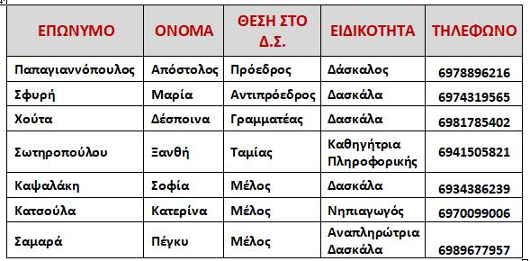 | ΕΠΩΝΥΜΟ | ΟΝΟΜΑ | ΘΕΣΗ ΣΤΟ Δ.Σ. | ΕΙΔΙΚΟΤΗΤΑ | ΤΗΛΕΦΩΝΟ |