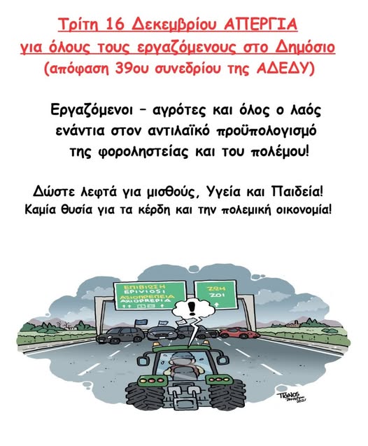16 του Δεκέμβρη, το δικό μας απεργιακό ποτάμι να στήσει πραγματικό μπλόκο στην πολιτική της κυβέρνησης και του κεφαλαίου! Να αντηχήσουν παντού τα δίκαια αιτήματά μας!