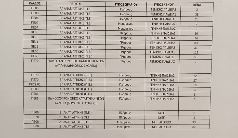 Κενά που δόθηκαν από τη Διεύθυνση Π.Ε. Αν. Αττικής στο Υπ. Παιδείας για την πρόσληψη αναπληρωτών