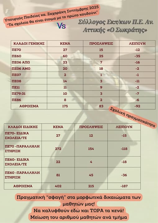 - Να καλυφθούν εδώ και τώρα όλα τα κενά με βάση όλες τις ανάγκες με άμεση β΄ φάση προσλήψεων. Να γίνουν όλες οι τοποθετήσεις όλων των συναδέλφων με πλήρη διαφάνεια και αντικειμενικότητα κι έχοντας στη διάθεσή τους όλα τα κενά κάθε φορά.