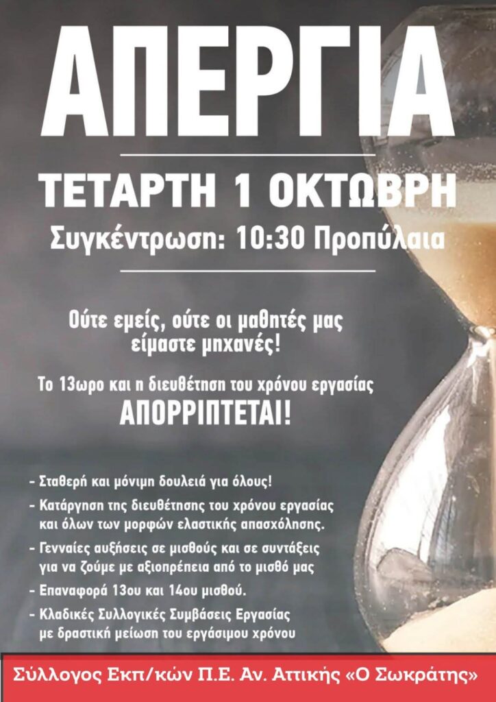 Τετάρτη 1η Οκτωβρίου απεργούμε ενάντια στο νομοσχέδιο της 13ωρης σκλαβιάς, για αυξήσεις μισθών και επιστροφή δώρων, για κάλυψη των αναγκών σε παιδεία – υγεία, όχι για του πολέμου τα σφαγεία, για όλα όσα μας βασανίζουν, για τις δικές μας ανάγκες.