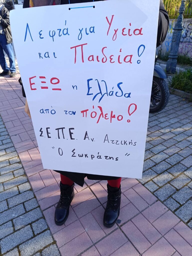 Όλα αυτά σε μια περίοδο που μεγαλώνει συνεχώς η πολεμική εμπλοκή της χώρας και θέλουν εμάς τους εκπαιδευτικούς να μην μιλάμε, να μη διεκδικούμε, να διδάσκουμε ως φυσικά φαινόμενα και αιώνια το τσάκισμα των δικαιωμάτων μας και τη μόρφωση των μαθητών/τριών μας, να θυσιάζουμε τις ανάγκες μας και τις ίδιες τις ζωές μας για τα κέρδη.