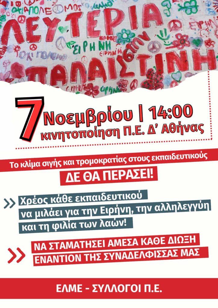 Το ΔΣ του Συλλόγου μας καταδικάζει με τον πιο κατηγορηματικό τρόπο την απαράδεκτη παρέμβαση του Διευθυντή Π.Ε. Δ’ Αθήνας στο εκπαιδευτικό έργο της συναδέλφισσας και μέλους του Συλλόγου «Ο Παρθενώνας», Ελευθερίας Παλαιστίδου, δασκάλας στο 3ο Δημοτικό Σχολείο Ταύρου, που είχε ως αποτέλεσμα την κλήση της σε έγγραφη απολογία, ξεκινώντας έτσι ουσιαστικά την πειθαρχική της δίωξη.