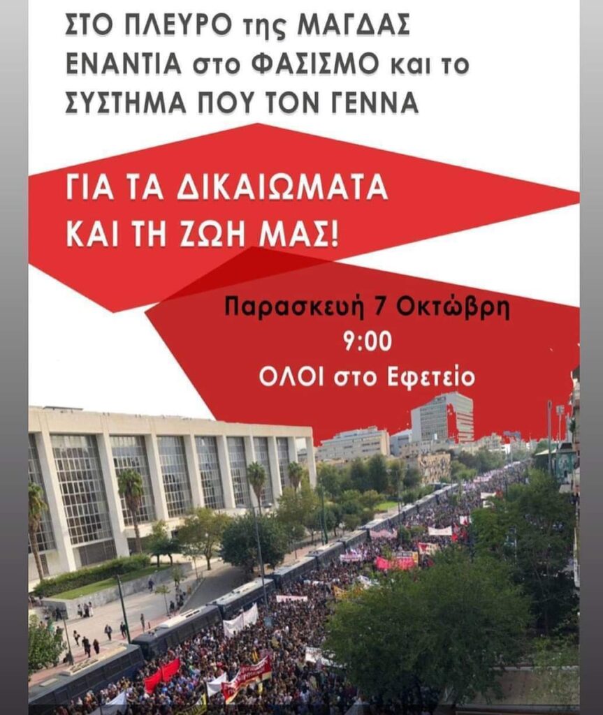 Στις 7 Οκτωβρίου συμπληρώνονται 2 χρόνια από τη μεγάλη συγκέντρωση έξω από το Εφετείο όπου χιλιάδες λαού διαδήλωναν, φωνάζοντας με μια φωνή να κλειστούν στη φυλακή οι δολοφόνοι εγκληματίες της Χρυσής Αυγής. Ήταν μια μεγάλη συγκέντρωση όπου οι δρόμοι πλημμύρισαν και εκεί συναντήθηκαν δεκάδες χιλιάδες φοιτητές, μαθητές, εργαζόμενοι με τα σωματεία τους, οι μετανάστες αλιεργάτες που δέχτηκαν τις δολοφονικές επιθέσεις, οι δικηγόροι που επί χρόνια ολόκληρα, που κράτησε η δίκη, ήταν εκεί καθημερινά, για να αναδείξουν ότι η Χρυσή Αυγή είναι εγκληματική οργάνωση και αυτό πηγάζει από τη ναζιστική της ιδεολογία. Τη μέρα εκείνη θα δώσει και την κατάθεση της η μητέρα του Παύλου, Μάγδα Φύσσα, για τη δίκη της Χρυσής Αυγής σε δεύτερο βαθμό!