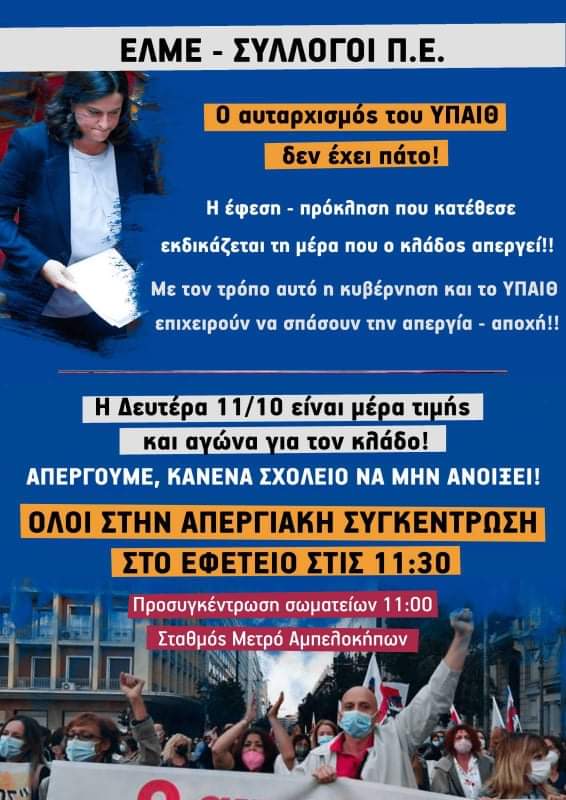Οι εκπαιδευτικοί έχουμε τη δύναμη να εξουδετερώσουμε τον αυταρχισμό της κυβέρνησης και να καταστήσουμε κενό γράμμα τον νόμο 4823/21 που θέλει να μετατρέψει τα σχολεία σε επιχειρήσεις και τη μόρφωση σε εμπόρευμα. Με τη συνέχιση του αγώνα μας και σε σύμπλευση με τους υπόλοιπους εργαζόμενους θα ακυρώσουμε και το τερατούργημα Χατζηδάκη, βάση του οποίου η όποια απεργία θα κρίνεται παράνομη από τη στιγμή που στρέφεται ενάντια σε νόμο του κράτους!!!