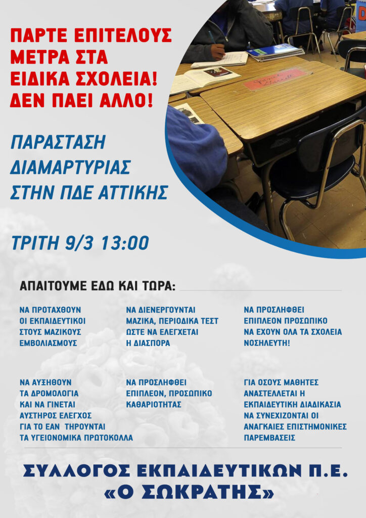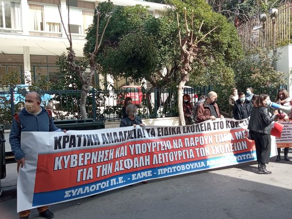 Την ανάγκη κλιμάκωσης του αγώνα με νέα κινητοποίηση για τη λήψη μέτρων προστασίας της υγείας μαθητών και εκπαιδευτικών στην Ειδική Αγωγή επισήμαναν εκπρόσωποι των συλλόγων και των φορέων που συμμετείχαν στη σημερινή παράσταση διαμαρτυρίας στην Περιφερειακή Διεύθυνση Εκπαίδευσης Αττικής με αφορμή τον θάνατο, από κορονοϊό, μαθητή του Ειδικού Σχολείου Πειραιά.Αναρμόδιος δήλωσε ο περιφερειακός διευθυντής στην αντιπροσωπεία των φορέων κατά την ολιγόλεπτη συνάντηση που είχαν.