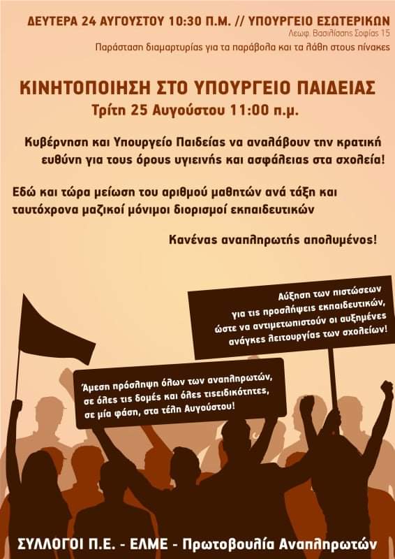 Εδώ και τώρα να στηρίξουν την Κινητοποίηση στο Υπουργείο Παιδείας την Τρίτη 25/8 στις 11:00 και στο Υπ. Εσωτερικών(για τα λάθη στους πίνακες του ΑΣΕΠ) τη Δευτέρα 24/8 στις 10:30!!