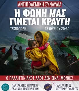 Δυναμώνουμε την Αλληλεγγύη μας στον Παλαιστινιακό Λαό! Συμμετέχουμε στη Συναυλία των Καλλιτεχνών στην ΤΕΧΝΟΠΟΛΗ του Δήμου Αθηναίων την Τετάρτη 18/6 στις 20:30!