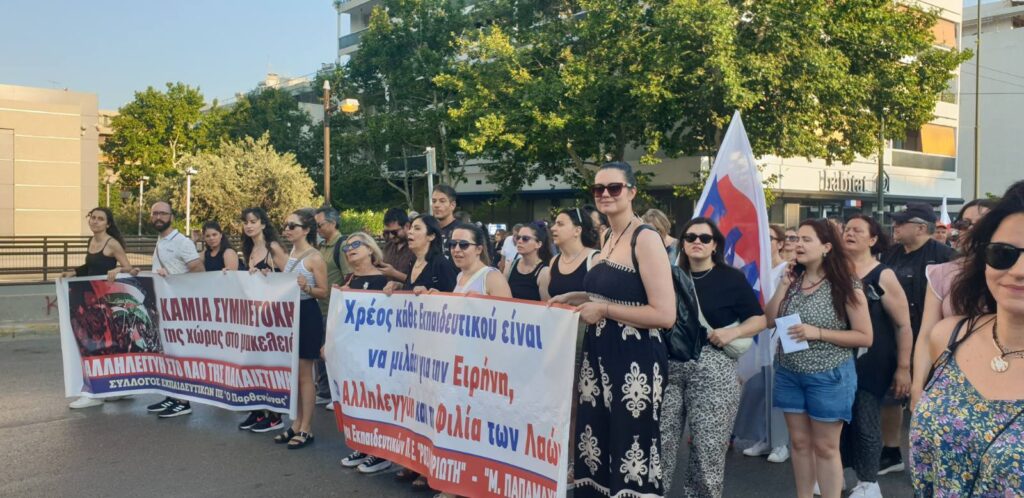 - Γιατί εμείς παλεύουμε ενάντια στον πόλεμο και την εμπλοκή της Ελλάδας σε αυτόν. Καταγγέλλουμε την ΕΕ και τις κυβερνήσεις, που εκπονούν πολεμικά σχέδια για τα συμφέροντα του κεφαλαίου. Κάνουν μπίζνες με το κράτος – δολοφόνο του Ισραήλ που διαπράττει βάρβαρη γενοκτονία σε βάρος του περήφανου παλαιστινιακού λαού. Συνδιαλέγονται με τον τζιχαντιστή Αλ Τζολάνι την ίδια ώρα που οι άγριες σφαγές στη Συρία συνεχίζονται. Γυρίζουν σαν τα κοράκια πάνω από τα συντρίμμια και τα αιματοβαμμένα χώματα της Ουκρανίας, για να αποκτήσουν μερίδιο από την πολεμική λεία. Όλοι αυτοί κλέβουν τον ιδρώτα και τον κόπο των εργαζομένων, τσακίζουν τα δικαιώματά μας στη δουλειά, την υγεία και την παιδεία, για να ξοδεύουν δισεκατομμύρια στους πολεμικούς εξοπλισμούς. Σκορπούν τον πόλεμο και την καταστροφή, που προκαλούν τα τεράστια κύματα των ξεριζωμένων προσφύγων και μεταναστών.