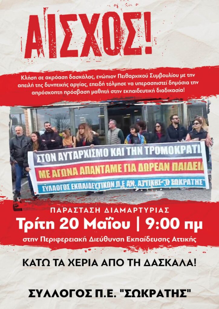 ΟΛΕΣ ΚΑΙ ΟΛΟΙ ΤΗΝ ΤΡΙΤΗ 20/5, στις 9:00 π.μ. στην κινητοποίηση στην Περιφερειακή Διεύθυνση Εκπαίδευσης Αττικής (Ξενίας 15, Αθήνα) και στις 12:00 στο Διοικητικό Εφετείο Πειραιά (Κολοκοτρώνη 55 – κοντά στον σταθμό μετρό Δημοτικό Θέατρο)