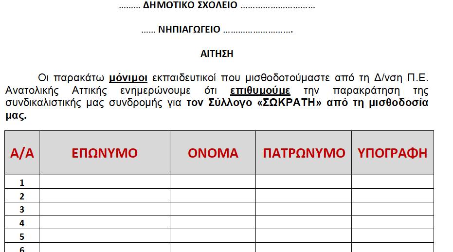σύμφωνα με νέα ενημέρωση από τη Δ/νση Π.Ε. Αν. Αττικής, για την παρακράτηση της συνδρομής του Συλλόγου μέσω της μισθοδοσίας των Μόνιμων εκπαιδευτικών, χρειάζεται θετική αίτηση (σύμφωνη γνώμη) των εκπαιδευτικών, ώστε η Υπηρεσία να προχωρήσει στην εν λόγω ενέργεια. Για τον λόγο αυτό επισυνάπτουμε σχετικό πίνακα στον οποίο οι εκπαιδευτικοί που επιθυμούν την παρακράτηση πρέπει να συμπληρώσουν τα στοιχεία τους και να υπογράψουν.
