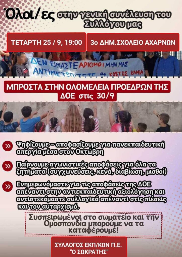 Όλοι και όλες στη γενική συνέλευση του συλλόγου » Σωκράτη» την Τετάρτη 25/9 στο 3ο Δημοτικό Σχολείο Αχαρνών στις 7 μ.μ. για να δώσουμε ακόμα μεγαλύτερη ώθηση στον αγώνα που κάνουμε και έχει στο επίκεντρο πάντα τα παιδιά μας και την παιδαγωγική μας υπόσταση!!
