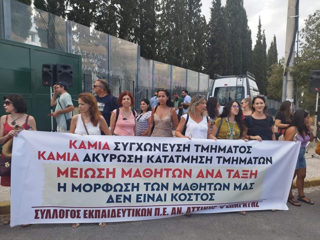 -Την ακόμα μεγαλύτερη υποβάθμιση που προωθεί η πολιτική των συγχωνεύσεων-συμπτύξεων. Με αυθαίρετες οδηγίες η παραπλανητική εγκύκλιος Κατσαρού στοχεύει στην εξοικονόμηση προσωπικού παραβιάζοντας ακόμα και την υπάρχουσα νομοθεσία σε βάρος των μορφωτικών δικαιωμάτων των μαθητών/τριών. Έτσι προωθείται, με βαθιά αντιπαιδαγωγικό και καθαρά λογιστικό τρόπο, η μείωση των τμημάτων, η βίαιη δημιουργία τμημάτων 25 μαθητών/τριών και οι περικοπές εκπαιδευτικού προσωπικού για τη νέα σχολική χρονιά. Η απάντηση του Υ.ΠΑΙ.Θ.Α. στους δίκαιους αγώνες των εκπαιδευτικών και των γονιών είναι ο αυταρχισμός και η καταστολή, όπως την βιώσαμε στη μεγάλη κινητοποίηση έξω από το Υ.ΠΑΙ.Θ.Α. στις 4 του Σεπτέμβρη με γκλοπ και χημικά απέναντι ακόμα και σε μικρά παιδιά.