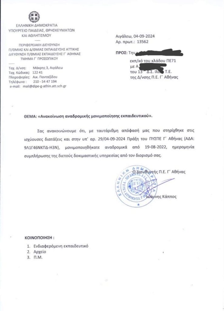 Δικαίωση για τον αγώνα των εκπαιδευτικών ενάντια στην αξιολόγηση. Βγήκαν οι αναδρομικές αποφάσεις μονιμοποίησης των νεοδιόριστων του 2020 στην Γ’ πρωτοβάθμια διεύθυνση Αθήνας.