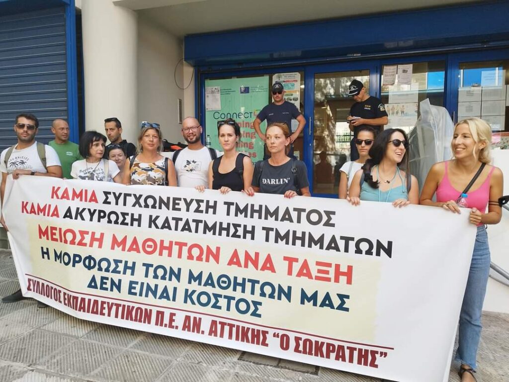 Πραγματοποιήθηκε χθες Παρασκευή 13/9 η προγραμματισμένη παράσταση διαμαρτυρίας του Συλλόγου Π.Ε. Αν. Αττικής «Ο Σωκράτης» και γονέων για τις απαράδεκτες συγχωνεύσεις τμημάτων, που οδηγούν στην σαρδελοποίηση των μαθητών στις σχολικές αίθουσες. Ο Περιφερειακός Διευθυντής Εκπαίδευσης, στα χνάρια του Υπουργού Παιδείας, απαξίωσε εκπαιδευτικούς και γονείς με το να μη τους δεχτεί.
