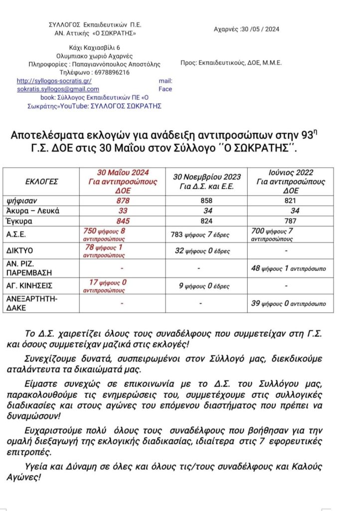Αποτελέσματα εκλογών για το συνέδριο της ΔΟΕ στον σύλλογο «Σωκράτη».