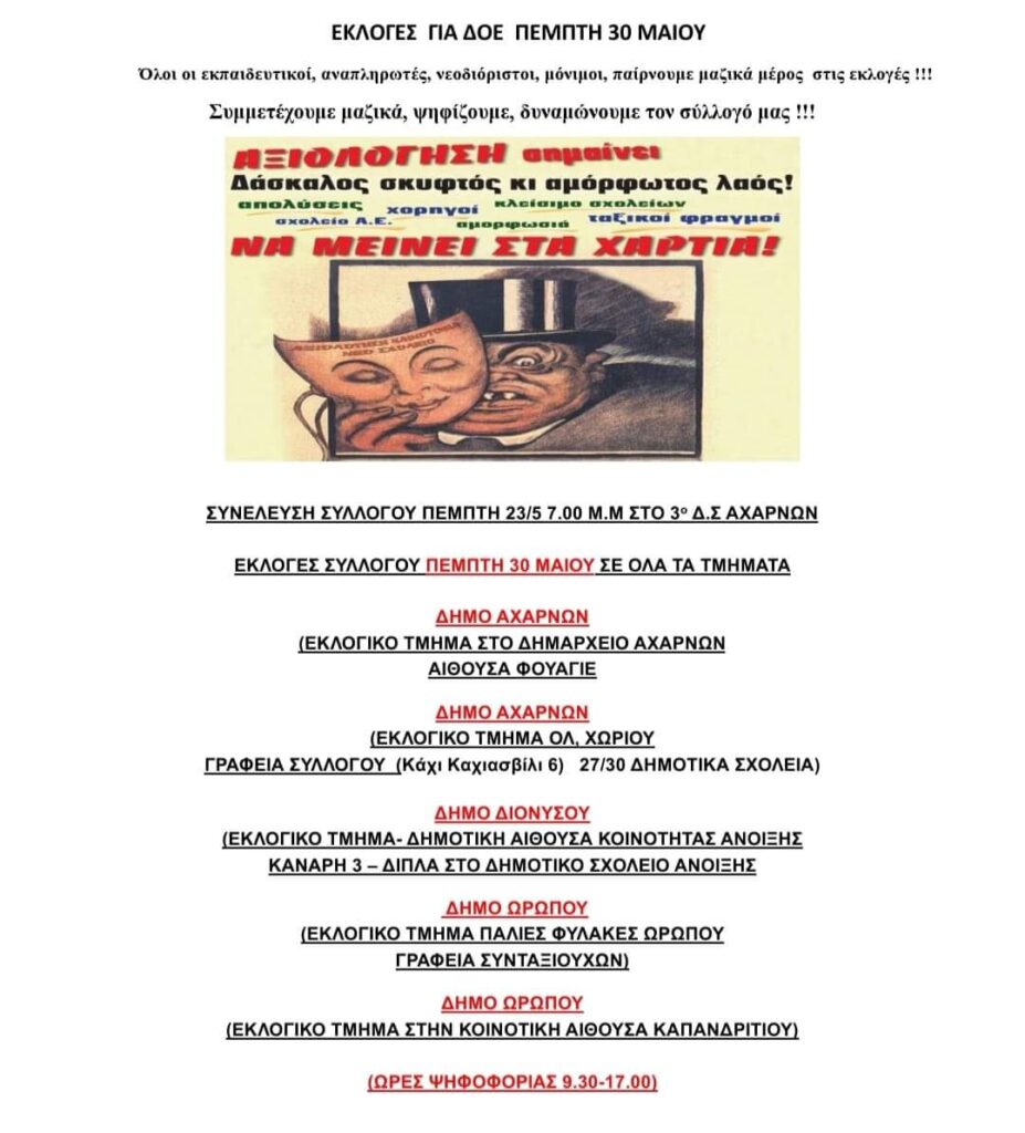 ΕΚΛΟΓΕΣ ΓΙΑ ΔΟΕ ΠΕΜΠΤΗ 30 ΜΑΪΟΥ
