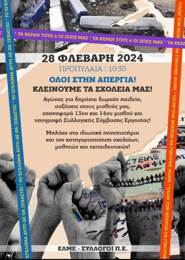 Με τη μαζική συμμετοχή στην απεργία της 28ης Φεβρουαρίου δίνουμε συνέχεια στον αγώνα απέναντι στο αυτόνομο, κατηγοριοποιημένο σχολείο της αγοράς, των χορηγών και της υποχρηματοδότησης, στον αγώνα που δίνουμε ως εκπαιδευτικοί για να διατηρήσουμε τον παιδαγωγικό μας ρόλο, τη συλλογική λειτουργία των συλλόγων διδασκόντων, το δικαίωμά μας να μπαίνουμε στην τάξη με ψηλά το κεφάλι.