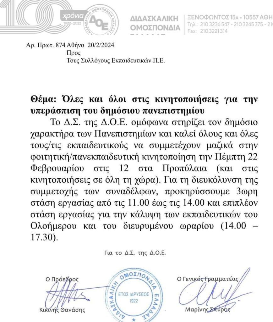 Το Δ.Σ. της Δ.Ο.Ε. ομόφωνα στηρίζει τον δημόσιο χαρακτήρα των Πανεπιστημίων και καλεί όλους και όλες τους/τις εκπαιδευτικούς να συμμετέχουν μαζικά στην φοιτητική/πανεκπαιδευτική κινητοποίηση την Πέμπτη 15 Φεβρουαρίου στις 12:00 στα Προπύλαια (και στις κινητοποιήσεις σε όλη τη χώρα). Για τη διευκόλυνση της συμμετοχής των συναδέλφων, προκηρύσσουμε 3ωρη στάση εργασίας από τις 11.00 έως τις 14.00 και επιπλέον στάση εργασίας για την κάλυψη των εκπαιδευτικών του Ολοήμερου και του διευρυμένου ωραρίου (14.00 – 17.30).