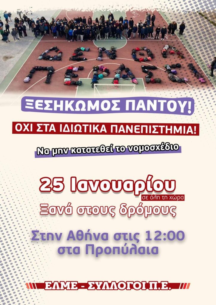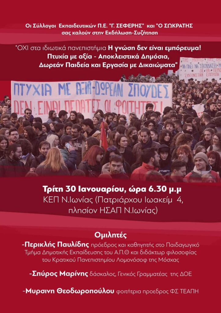 ΚΑΛΕΣΜΑ ΣΤΗΝ ΕΚΔΗΛΩΣΗ – ΣΥΖΗΤΗΣΗ ΙΔΙΩΤΙΚΑ ΠΑΝΕΠΙΣΤΗΜΙΑ ΤΗΝ ΤΡΙΤΗ 30 ΙΑΝΟΥΑΡΙΟΥ ΣΤΙΣ 18:30 στο ΚΕΠ Ν. ΙΩΝΙΑΣ (Πατριάρχου Ιωακείμ 4, πλησίον ΗΣΑΠ Ν. Ιωνίας)