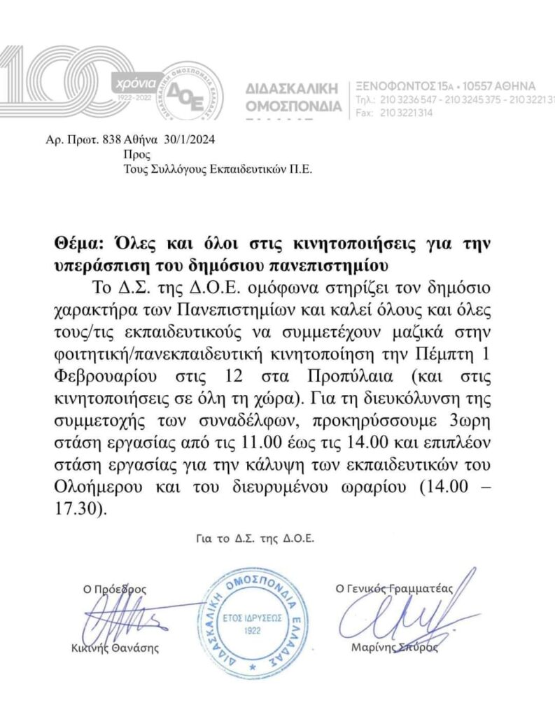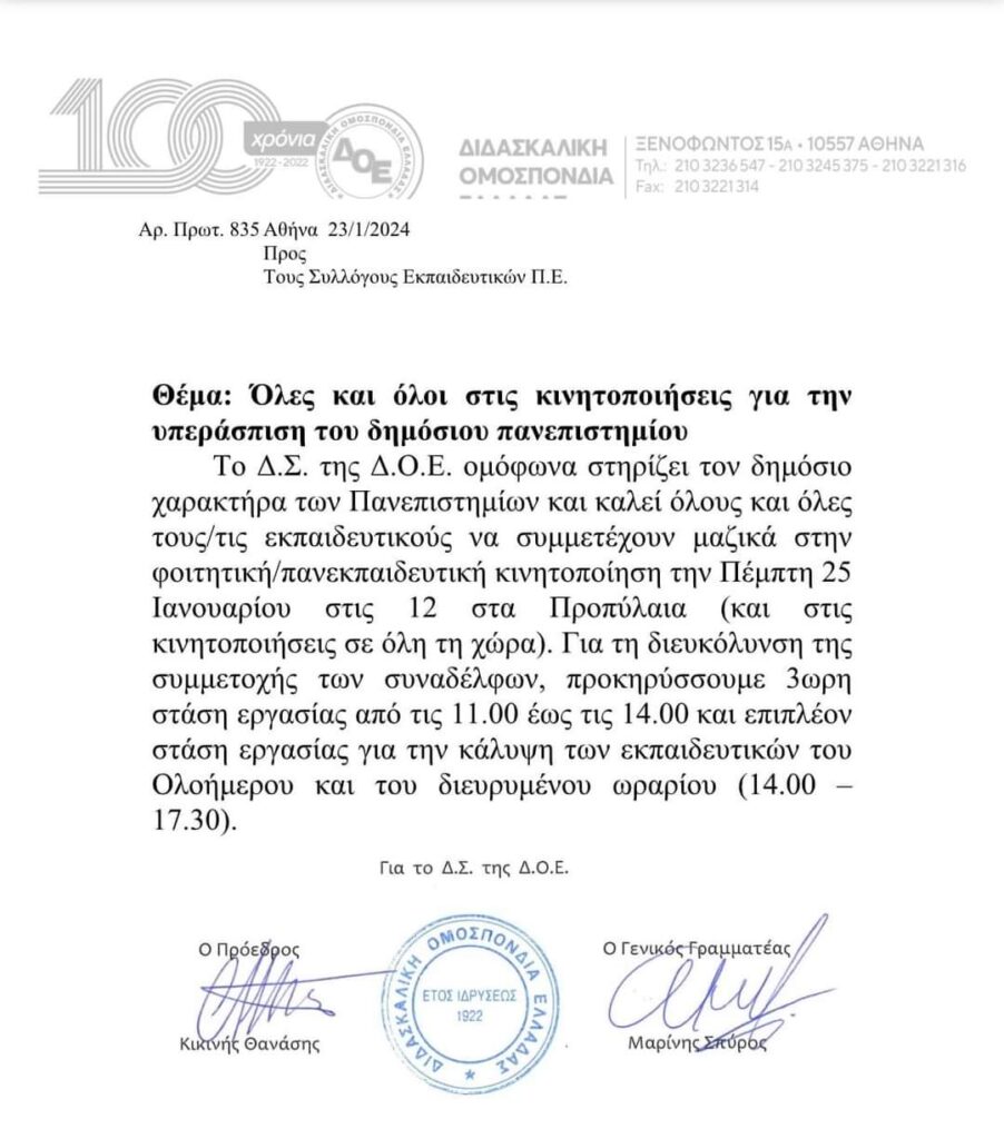 Το Δ.Σ. της Δ.Ο.Ε. ομόφωνα στηρίζει τον δημόσιο χαρακτήρα των Πανεπιστημίων και καλεί όλους και όλες τους/τις εκπαιδευτικούς να συμμετέχουν μαζικά στην φοιτητική/πανεκπαιδευτική κινητοποίηση την Πέμπτη 25 Ιανουαρίου στις 12 στα Προπύλαια (και στις κινητοποιήσεις σε όλη τη χώρα). Για τη διευκόλυνση της συμμετοχής των συναδέλφων, προκηρύσσουμε 3ωρη στάση εργασίας από τις 11:00 έως τις 14:00 και επιπλέον στάση εργασίας για την κάλυψη των εκπαιδευτικών του Ολοήμερου και του διευρυμένου ωραρίου (14.00 – 17.30).