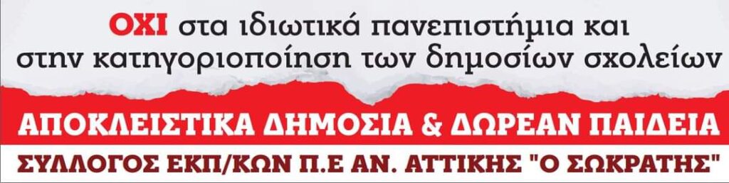 Το Δ.Σ. του Συλλόγου μας καταδικάζει την προσπάθεια ίδρυσης ιδιωτικών – μη κρατικών πανεπιστημίων από την κυβέρνηση της ΝΔ και καλεί εκπαιδευτικούς, γονείς και εργαζόμενους σε μαζική συμμετοχή στις κινητοποιήσεις για να μην περάσουν τα σχέδιά τους, που ιδιωτικοποιούν παραπέρα τη δημόσια Παιδεία, χτυπούν τα μορφωτικά δικαιώματα των παιδιών μας και διαλύουν τα εργασιακά δικαιώματα όλων των αποφοίτων, άρα και των εκπαιδευτικών που έχουν ήδη χτυπηθεί από τον ν. Γαβρόγλου.