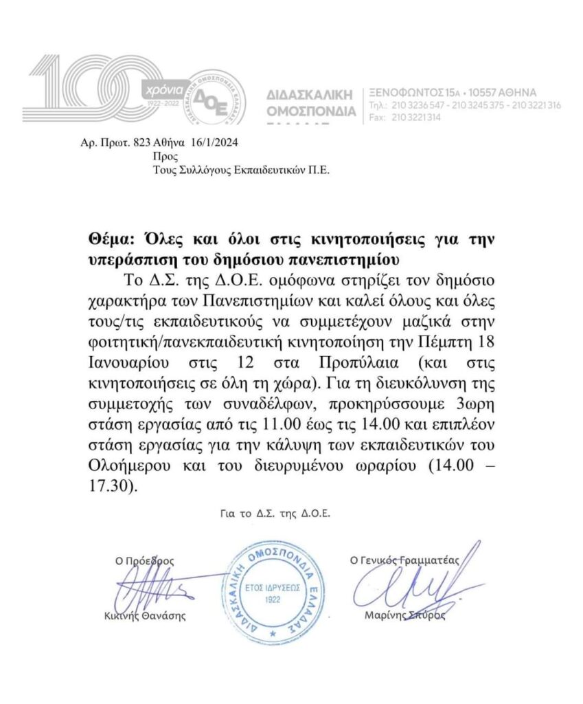 Μαζί με τους φοιτητές και τους μαθητές, τους πανεπιστημιακούς, τους εργαζόμενους των άλλων κλάδων παίρνουμε θέση μάχης για να μην περάσει αυτό το νομοσχέδιο.