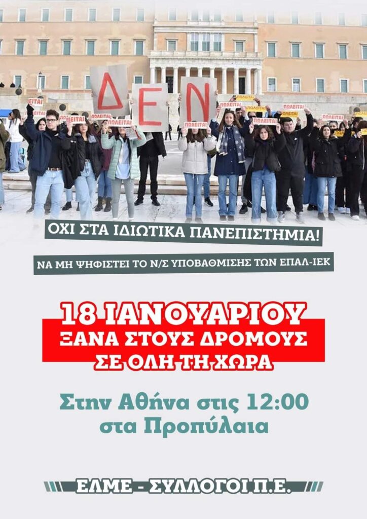 · Συμπόρευση και συντονισμός με τον αγώνα φοιτητών-μαθητών-πανεπιστημιακών-εργατικών σωματείων ενάντια στην ίδρυση ιδιωτικών πανεπιστημίων με κλιμάκωση των κινητοποιήσεων. Πρώτος σταθμός 18/1 στις 12:00.