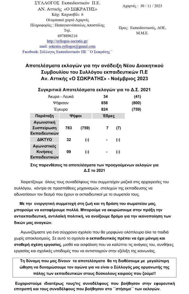 - Απείχαμε από τις ηλεκτρονικές εκλογές παρωδία για τους αιρετούς και φυσικά δεν αναγνωρίζουμε όσους βγήκαν με συμμετοχή 5-15%. Ταυτόχρονα το Δ. Σ. παρεμβαίνει συνεχώς στη ΔΙΠΕ Αν. Αττικής για κάθε πρόβλημα των συναδέλφων ή των σχολείων μας.