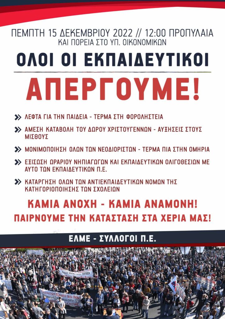 Την Πέμπτη 15 του Δεκέμβρη κλείνουμε τα σχολεία σε όλη την Ελλάδα!! Συμμετέχουμε στην 24ωρη απεργιακή κινητοποίηση ΔΟΕ – ΟΛΜΕ (Αθήνα, Προπύλαια 12:00 και πορεία στο Υπ. Οικονομικών, και σε όλη την Ελλάδα).